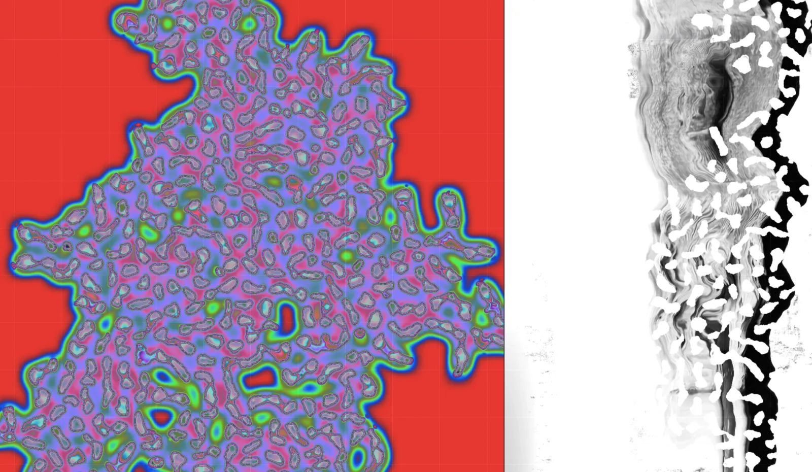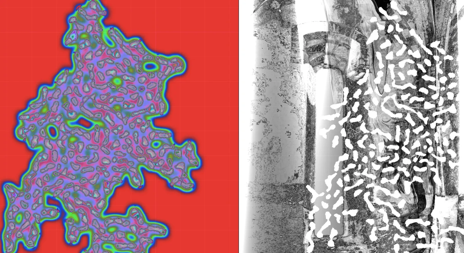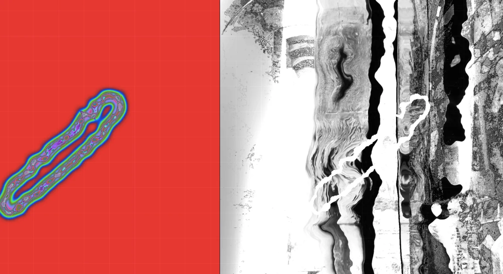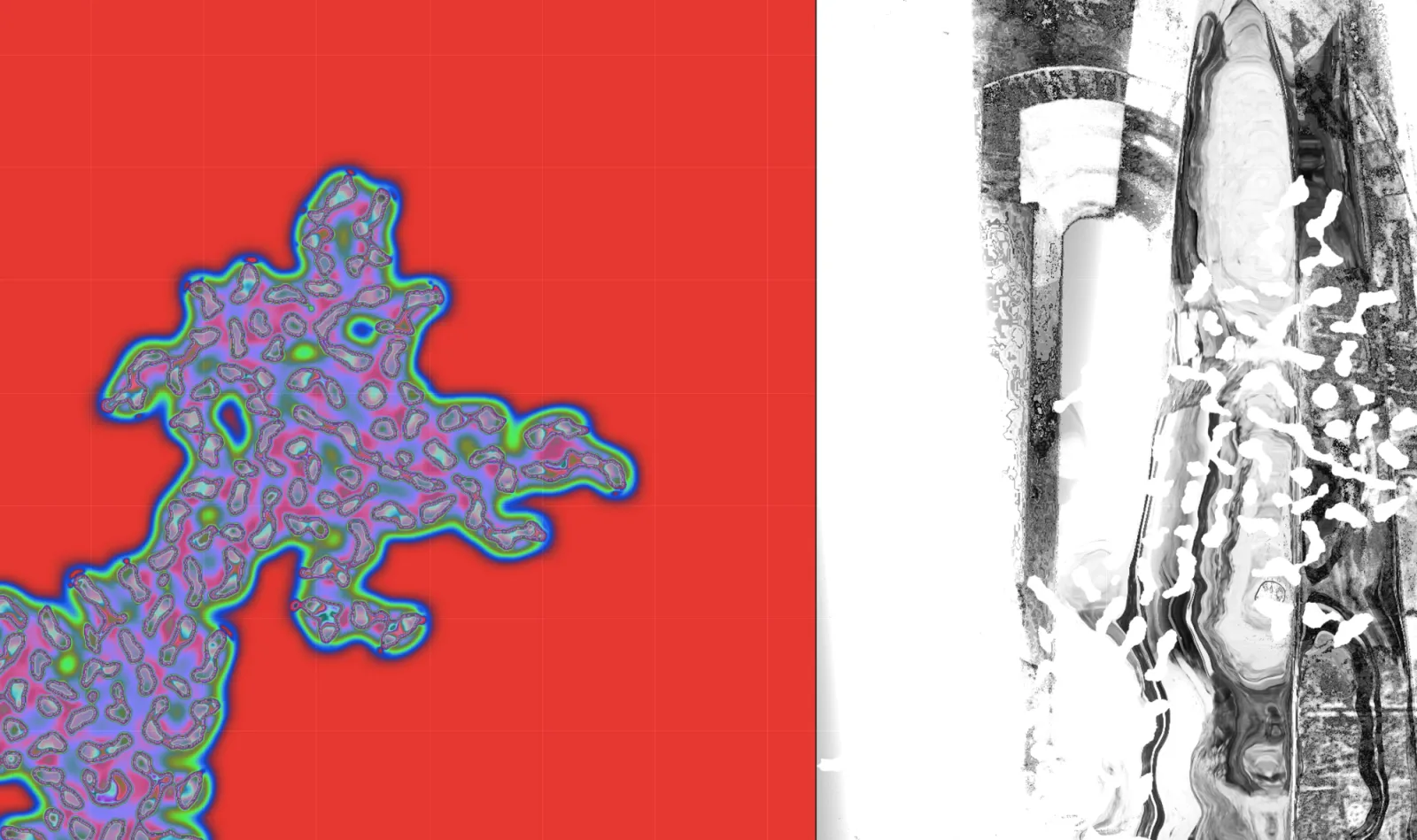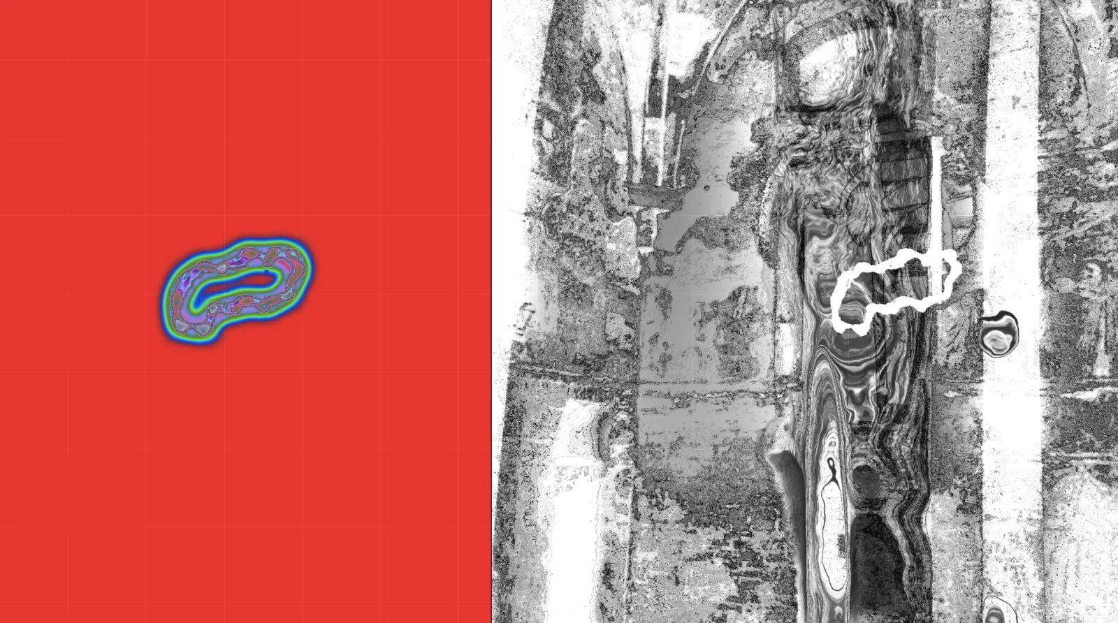 All'interno della proiezione, divisa in due pannelli, forme organiche avanzano nello spazio come viste al microscopio; esse interagiscono con le tracce d'archivio del sito, il Convento di San Francesco. Le memorie fotografiche in questione diventano frammenti visivi deteriorati, solo parzialmente riconoscibili, soggetti all'attività erosiva che subiscono perpetuamente. L'architettura, tuttavia, non è una forma passiva, ma un oggetto vivo che beneficia di queste alterazioni, cambiando aspetto pur conservando sempre tracce della sua vita passata, arricchita da ogni trasformazione.