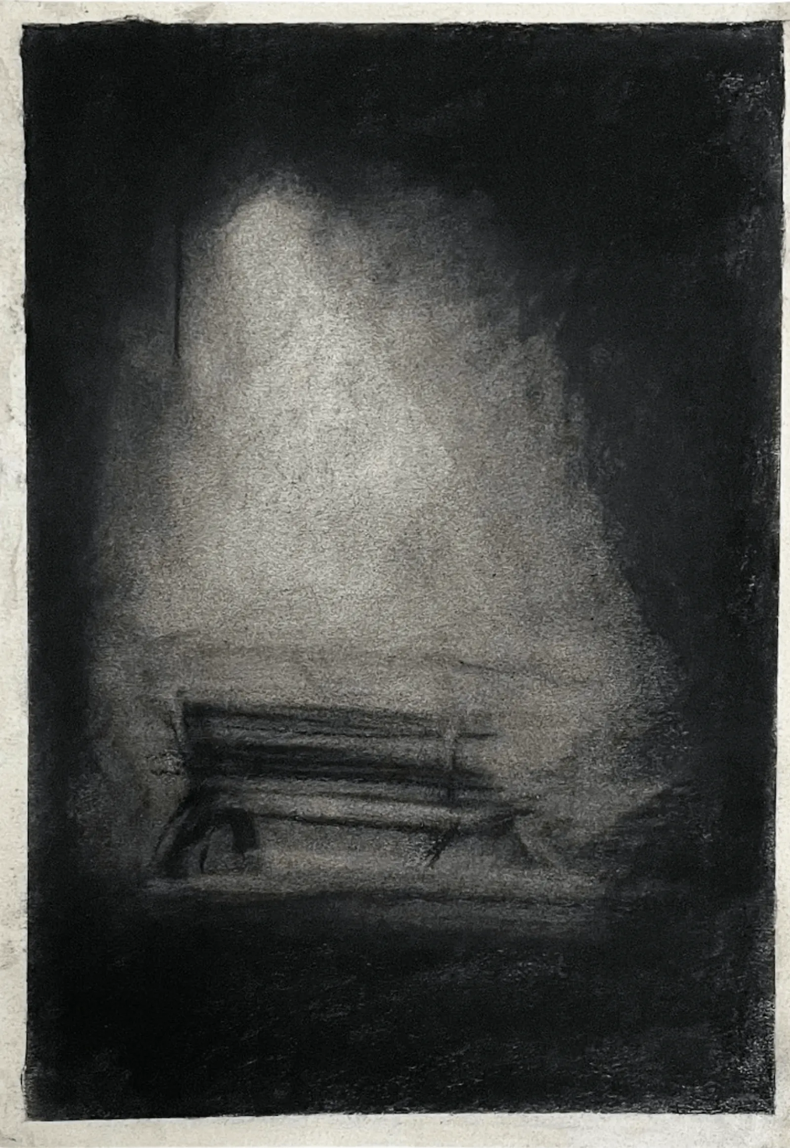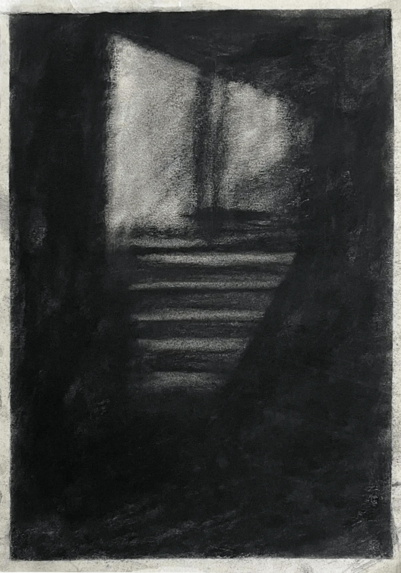 Il nero materico del carboncino, l'espressività del segno e la trama distintiva della composizione elettroacustica operano sullo stesso piano, generando una profondità inquietante e una narrazione sensoriale segnata da tensioni e sospensioni. Riferimenti a paesaggi naturali e artificiali emergono sia nel disegno che nel suono, senza mai stabilizzarsi in una rappresentazione definita, lasciando allo spettatore un persistente senso di inquietudine e di disturbo irrisolto.