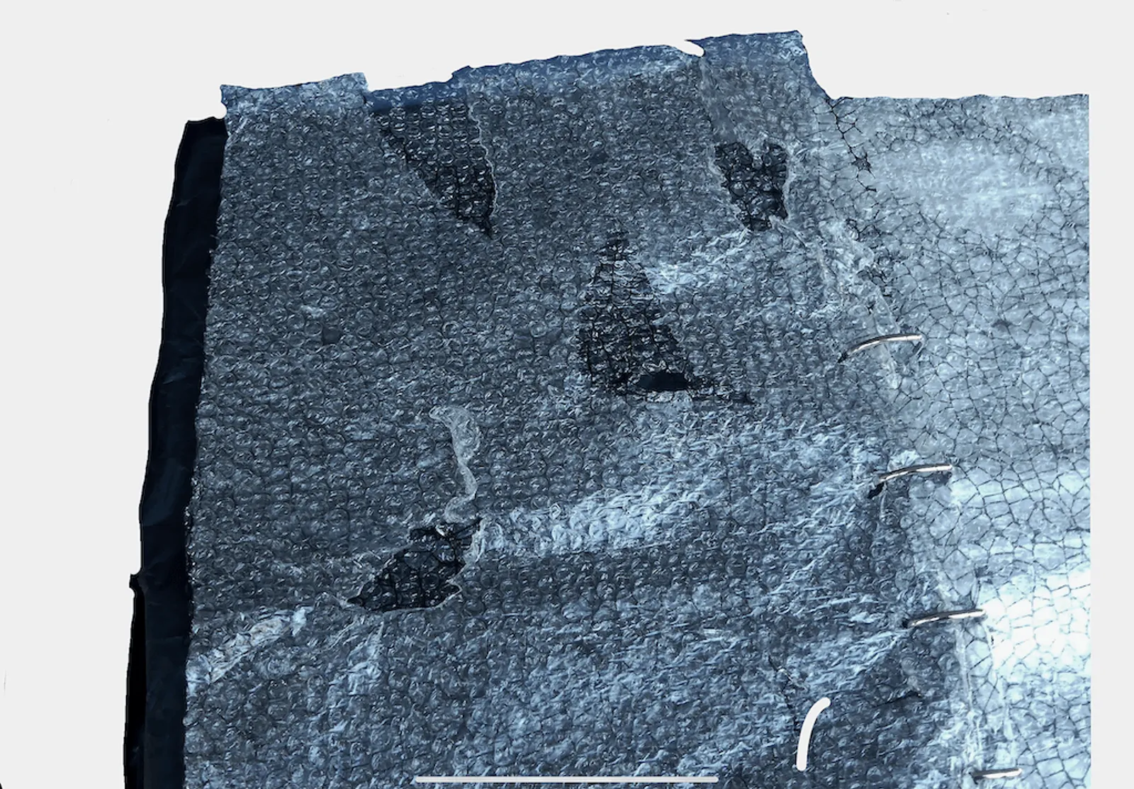 La luce invernale, inclinata e imperfetta, diventa un prisma attraverso il quale il paesaggio sonoro si frantuma, dando luogo a un ciclo di dissoluzione e ricomposizione. L'ambiente musicale si concepisce come una superficie instabile, segnata da vuoti sempre più pregnanti, da distorsioni che si accumulano fino a esplodere in una sorta di meltdown sonoro, e da silenzi che acquistano corpo e risonanza fino a trasformarsi essi stessi in materia sonora autonoma. Il discorso sonoro si struttura come un processo di dilatazione temporale e progressiva disintegrazione, e come rapporto tra due linee di forza contrapposte: da un lato un andamento relativamente stabile, con armonie lente, pesanti, ispirate alle melodie d’organo, sottoposto a progressiva rarefazione: i suoni si frammentano, le parole si riducono a sospiri, respiri, sussurri, risonanze di pedali; dall'altro lato un silenzio che cresce di tensione: echi, click di valvole, distorsioni elettroniche, rumori urbani, fino al collasso. Ciò che resta è il vuoto, ma un vuoto vivo: i silenzi diventano materia sonora, amplificata da microfoni a contatto e riverberata nello spazio, fino a trasformarsi in loop e feedback che chiudono l’opera. Il feedback non è altro che l’accumulo di risonanze, che inizialmente possono esprimersi solo nel silenzio. Il loro accavallarsi genera questa “lacerazione” sonora. L'opera d’arte, in simbiosi col brano musicale, si presenta come un libro d'artista espanso, un corpo fragile che invita all'avvicinamento attento e al gesto lento. Tradizionalmente luogo di protezione, il libro diventa qui una pelle sensibile, sottoposta a tensione, pressione e progressiva rivelazione. Girare le pagine significa partecipare a un processo di disgregazione: il pluriball si deforma, scoppia e rivela ciò che custodisce, trasformando il gesto dello spettatore in azione performativa. Frammenti di mosaico, fili e materiali traslucidi tracciano punti di frattura e di sutura. La luce non illumina ma incide, pesa e lascia una traccia interiore più che una forma visibile, evocando la poesia "There's a certain Slant of light" di Emily Dickinson.